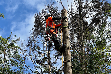 2年目には、ツリークライミングやチェーンソー、フルハーネスの特別教育や、ロープ高所作業などの講習を受け、特殊伐採の技術習得を進めました。みなかみ町にはこの技術を持つ人がおらず、私自身、自衛隊時代にヘリからロープで降下する訓練などの経験があったこともあり、挑戦しました。