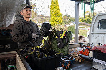 協力隊になった1年目から、任期終了後のことを考えていました。森で木を切り、薪を売るだけでは生計を立てるのは難しいと感じていたためです。みなかみ町に移住する少し前に「特殊伐採」という仕事があることを知りました。建物など周囲に障害物がある場合に、通常の伐採ができない場所で木を切るための技術です。ロープで木に登り、チェーンソーで枝を切ってロープで吊り下ろしたり、木そのものを分割しながら伐採したりします。